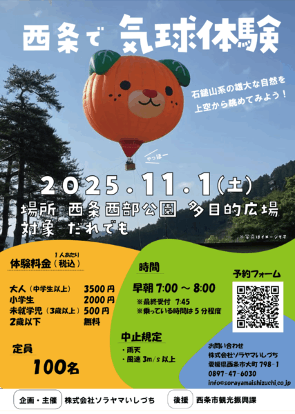 愛媛県がイメージアップキャラクターみきゃんを模った熱気球が西条の西部公園に来ます。