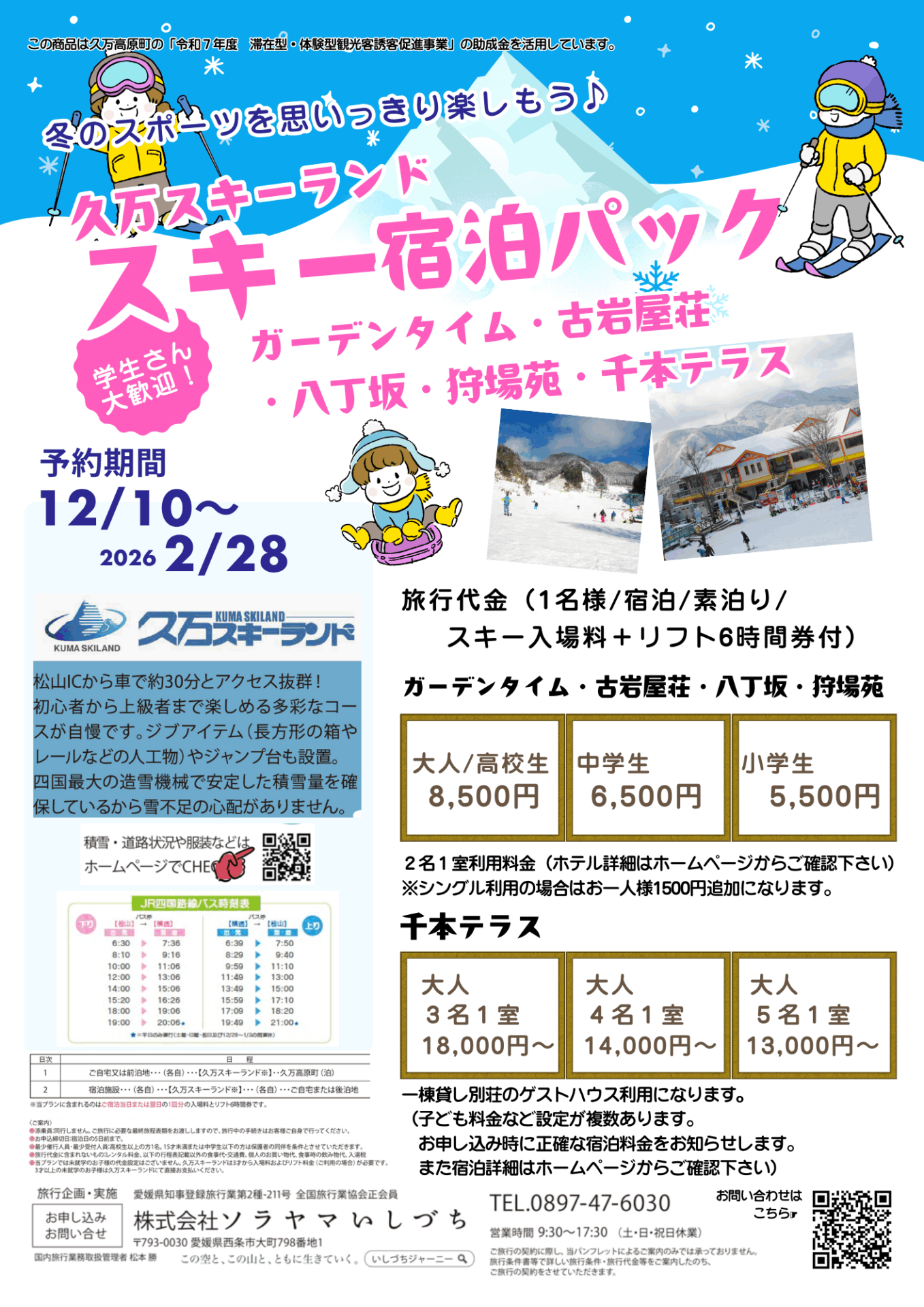 松山ICから車で約30分、平均標高800mの冷涼な気候に恵まれ、“四国の軽井沢”と呼ばれる久万高原町。その久万高原町でのスキーと宿泊をセットにしたお得なプランを発売します。